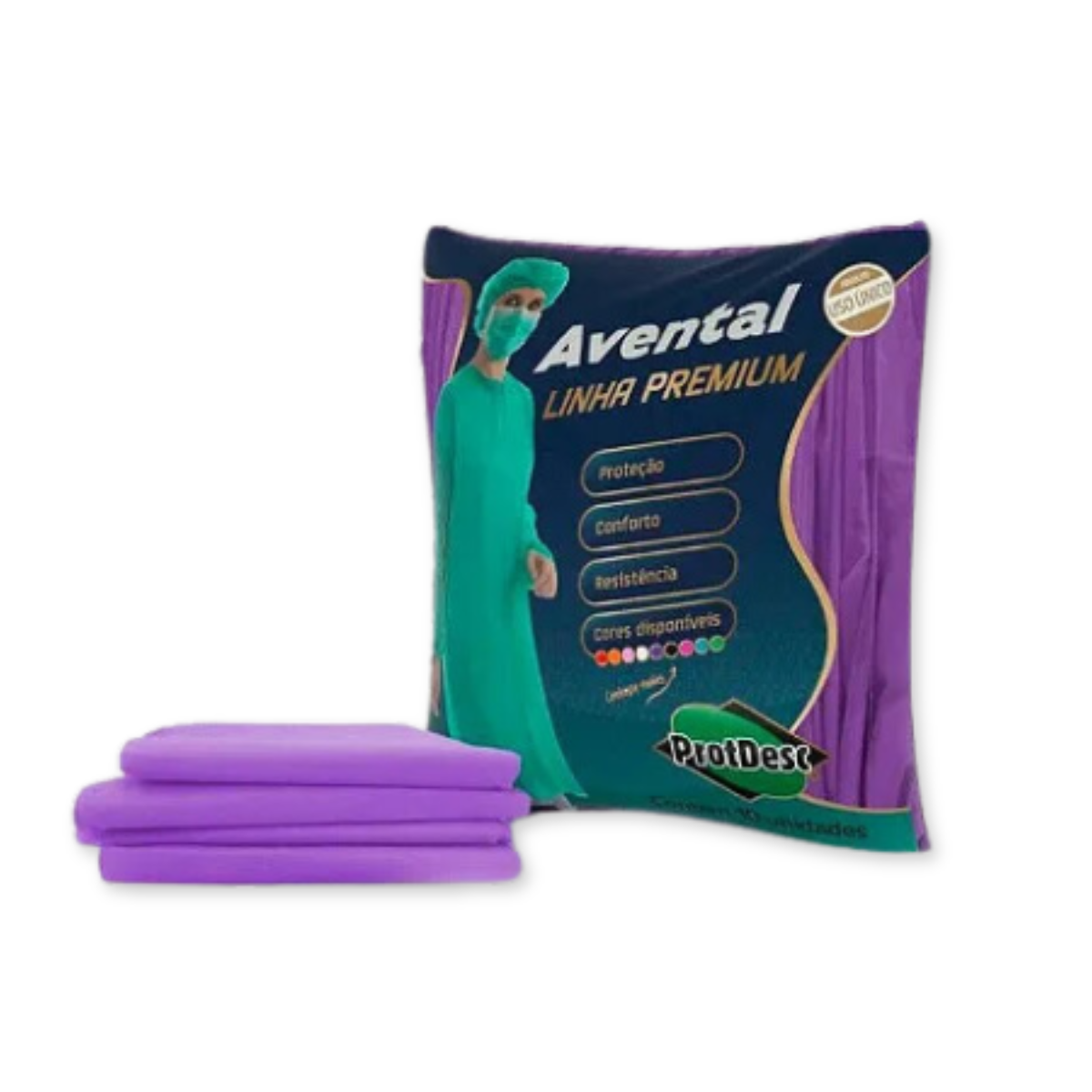 Avental Descartável Manga Longa Lilás 20gm Protdesc 10 Unidades: Tem punho com elástico, e é indicado para uso hospitalar e estético e em procedimentos, exames e ambientes que necessite de higiene constante.