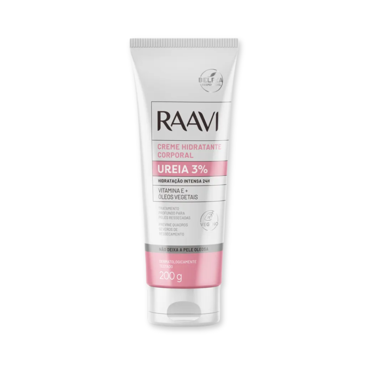 Creme Hidratante Corporal Ureia 3% 200g Raavi: Ideal para tratar e prevenir rachaduras, proporcionando uma hidratação prolongada. É especialmente recomendado para áreas como pés, mãos, joelhos e cotovelos, onde a pele tende a ser mais seca.