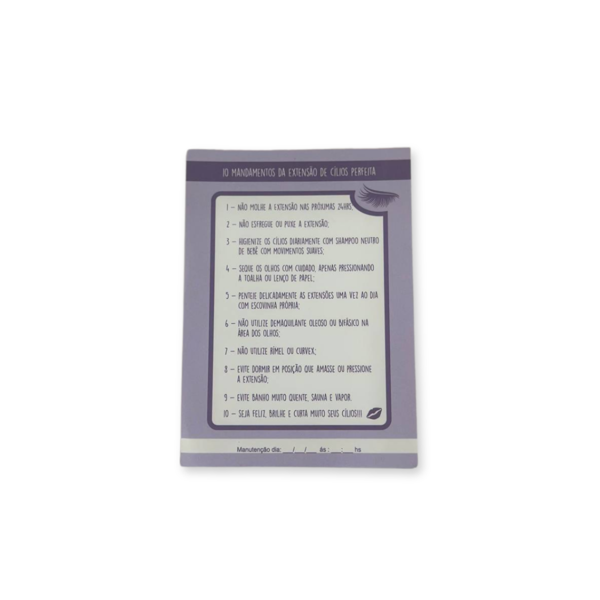 • Instruções Claras: Cada ficha contém orientações detalhadas sobre como cuidar das extensões de cílios após a aplicação.