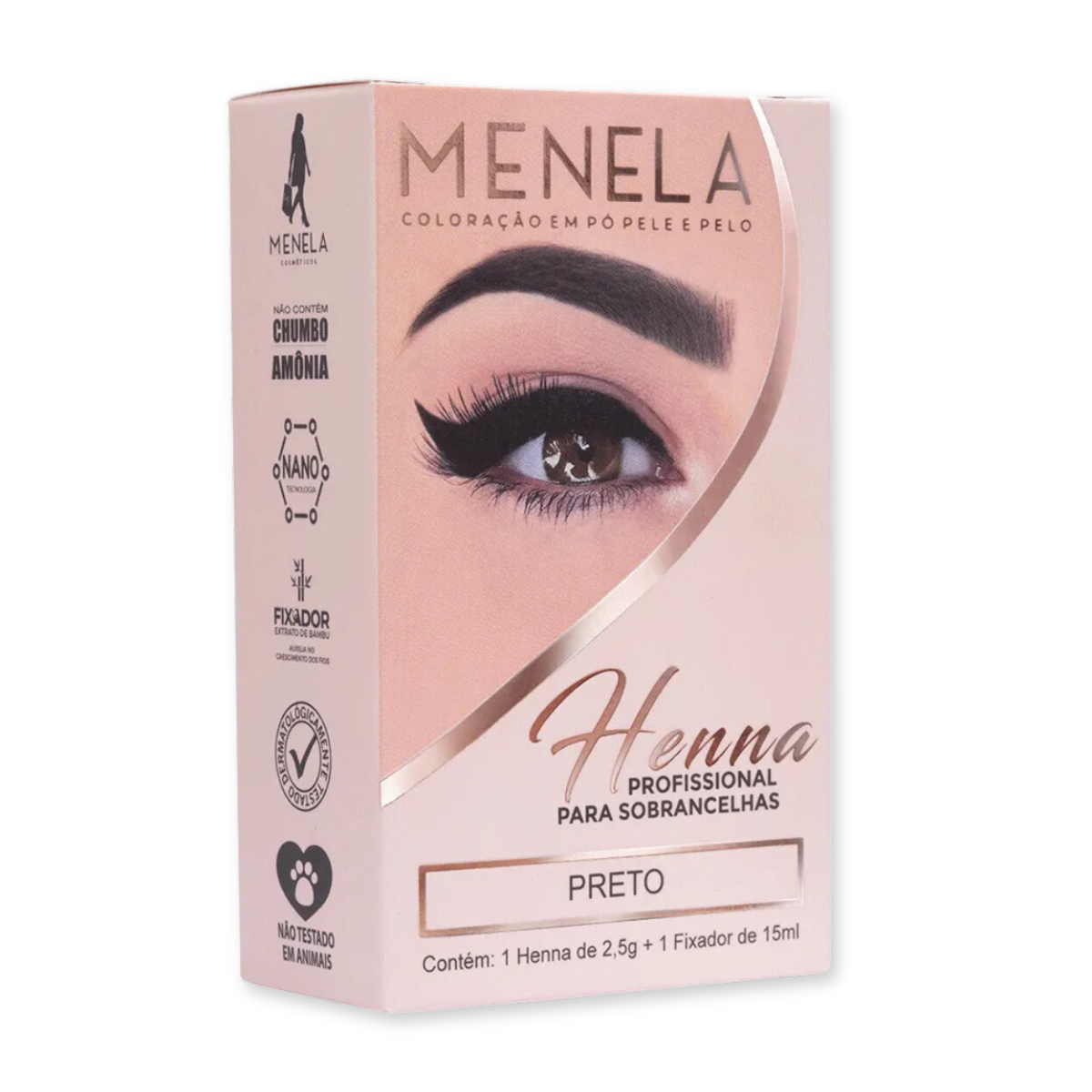Kit Henna Menela Preto: Desenvolvida com nanotecnologia, a Henna Menela, penetra profundamente nas camadas da pele, oferecendo uma coloração rápida e eficaz tanto nos pelos quanto na pele. Livre de chumbo, amônia e peróxido de hidrogênio, esta henna é segura e livre de metais pesados. Com extrato da planta Lawsonia inermes e micro partículas, proporciona uma aplicação fácil e um resultado duradouro.